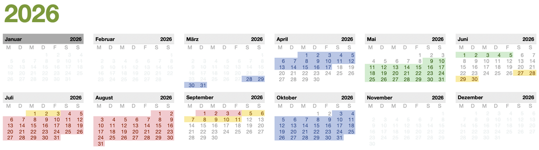 Der folgende Saisonkalender gilt analog für alle 3 Häuser. Alle Häuser werden vermietet in der Zeitspanne zwischen dem Beginn der deutschen Osterferien und dem Ende der deutschen Herbstferien (+/- ein paar Tage). Auf Anfrage und unter bestimmten Bedingungen öffnen wir das Haus auch gern in der übrigen Zeit, Preise und Voraussetzungen dafür könnt Ihr einfach über das Formular anfragen.