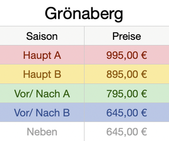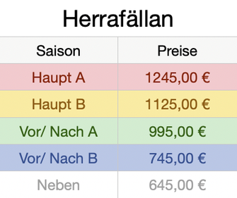 Wir mögen es gern einfach - daher verstehen sich alle Preise immer für weitestgehend alle Ausstattungsmerkmale des jeweiligen Hauses. Einzig Strom, unser Gästehaus in Herrafällan und zusätzliche bzw. externe Dienste (Internet, Wäscheservice) sind extra zu bezahlen.
